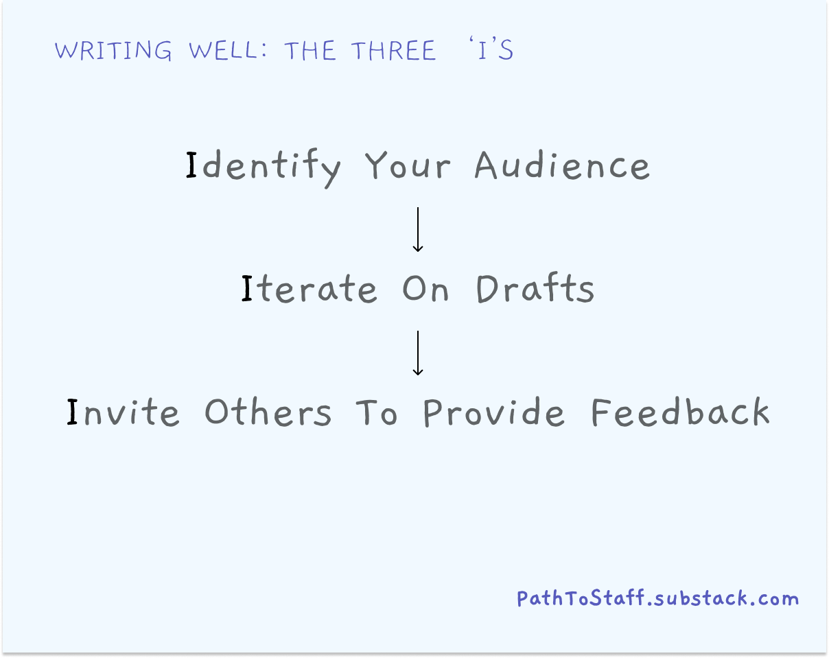 To keep things simple, here are three 'I's to remember when writing: Identify, Iterate, and Invite.