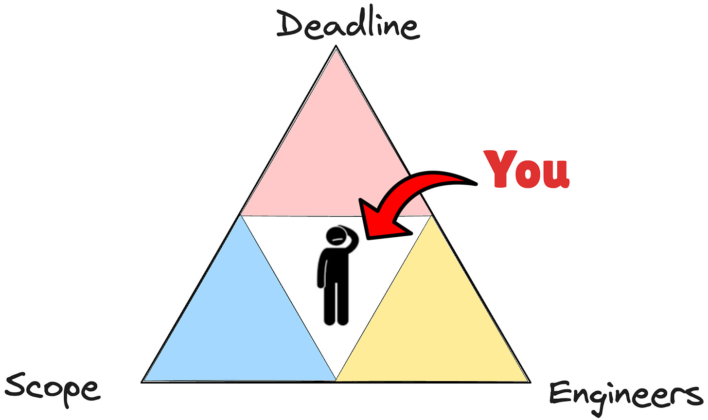 From a previous article, I talked about the PM triangle: There are 3 variables to deliver work: Scope, people, and deadline. If the deadline is fixed and, in theory, you can’t move it, you can reduce the scope or add more people to the project. So those two are the variables my team plays with most of the time, and moving the deadline is the last resort for some projects that have the freedom to move it.