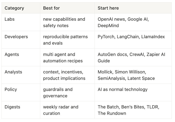 Iāve grouped the best sources into six buckets. Core labs and platforms. Developers and builders. Agents and automation. Independent analysts and practitioners. Policy, safety, governance. News digests for busy humans.