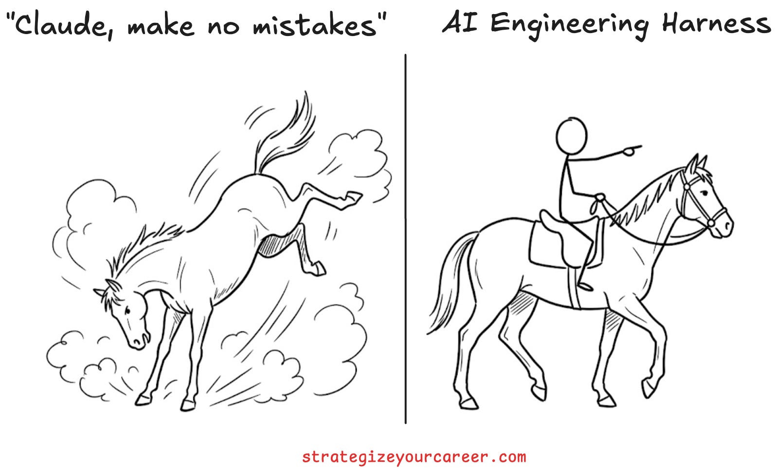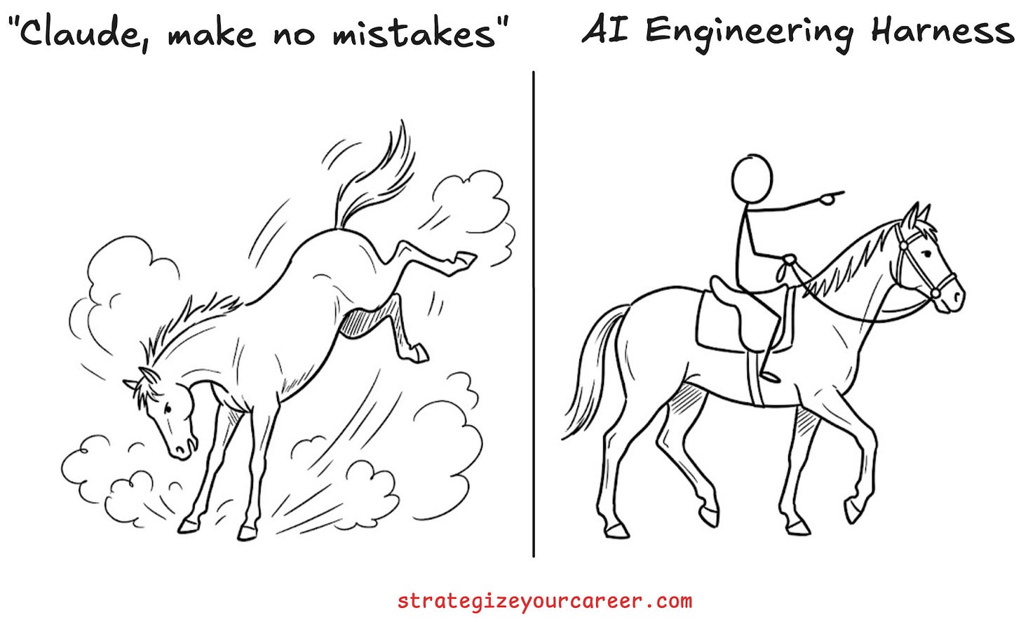 The term was first coined by Mitchell Hashimoto, the founder of HashiCorp. The metaphor comes from horse riding. Think of the LLM as a powerful horse. It has raw energy, speed, and strength. But without reins, a saddle, and a bridle, that energy is undirected and potentially destructive (the horse kicks you, the LLM runs a rm -rf, and I don’t know which is worse). The harness allows the rider to direct the horse’s power productively.