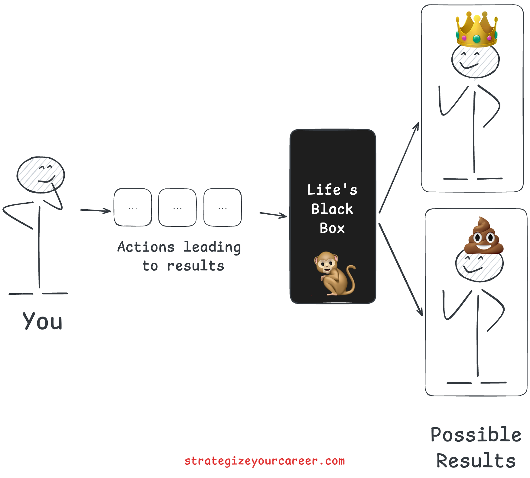 Consider your life as a black box system. Inputs go in. Time passes inside the black box. Outputs come out. You cannot control the internal mechanics of all life areas; they are too complex. Sometimes it looks like a monkey controls those mechanics. You can only control inputs.