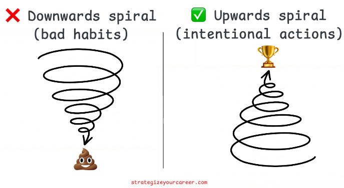 You must be careful not to let your career success spiral create a death spiral in your health, relationships, or other life areas. In your early career, one unit of effort often yields one unit of result. Later in your career, you face diminishing returns where one unit of effort may only yield half a unit of result. Pushing harder without a strategy is not sustainable.