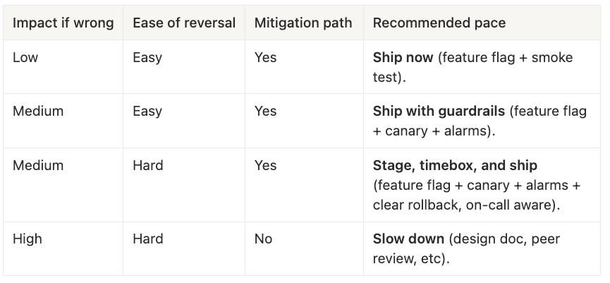 Reversal options change everything. If I can roll back in ~10 minutes because I have alarms, canary checks, and a pre-wired rollback, I bias toward speed. When reversal is painful (e.g., a destructive migration), I do design notes, peer review, and a rehearsal.