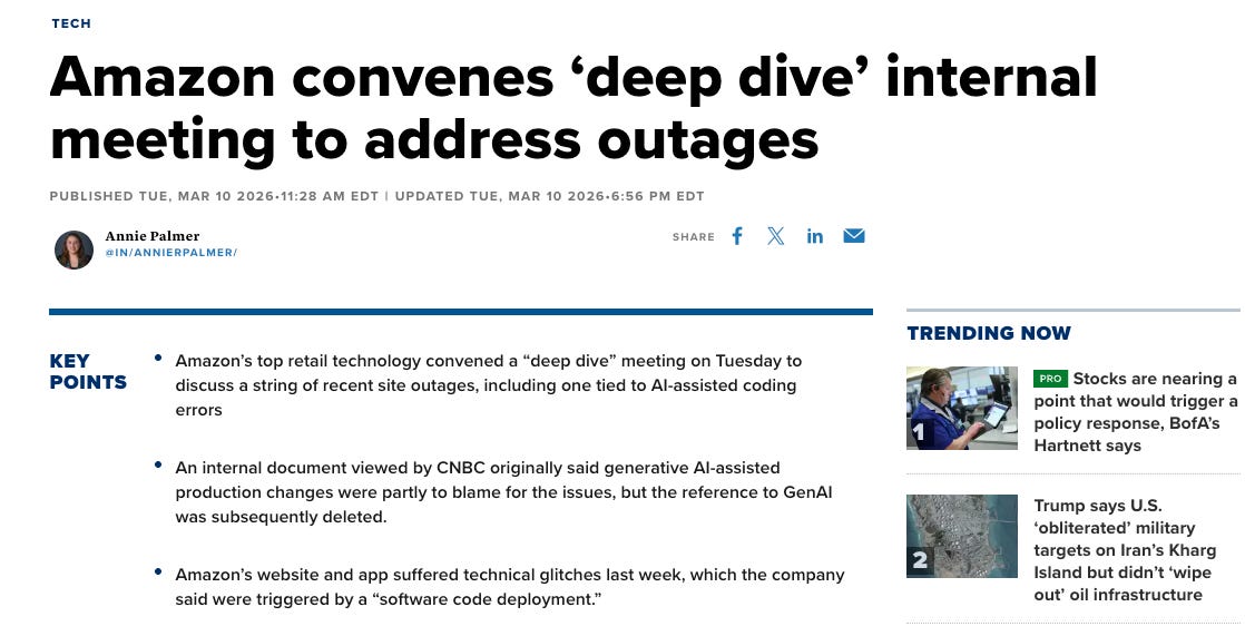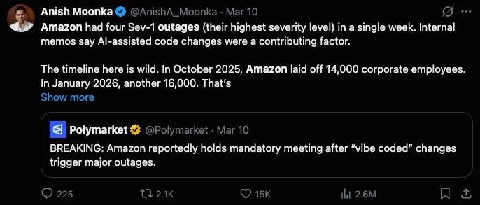 AI causes outages by breaking production directly or by flooding engineers with so much code that reviews become sloppy.