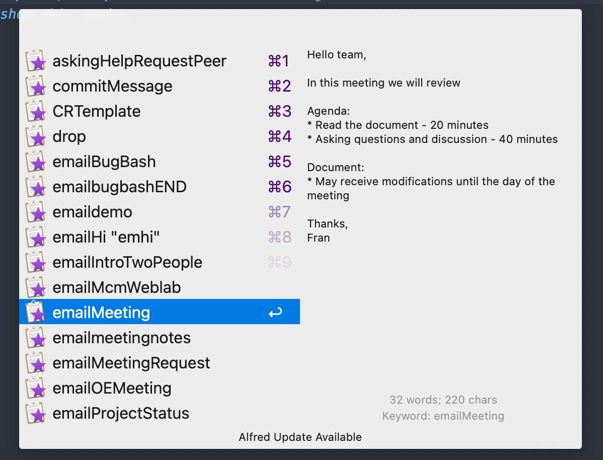 I prefer using Alfred snippets, with a shortcut, and typing a few letters to identify my snippet I just paste it immediately. Zero friction.