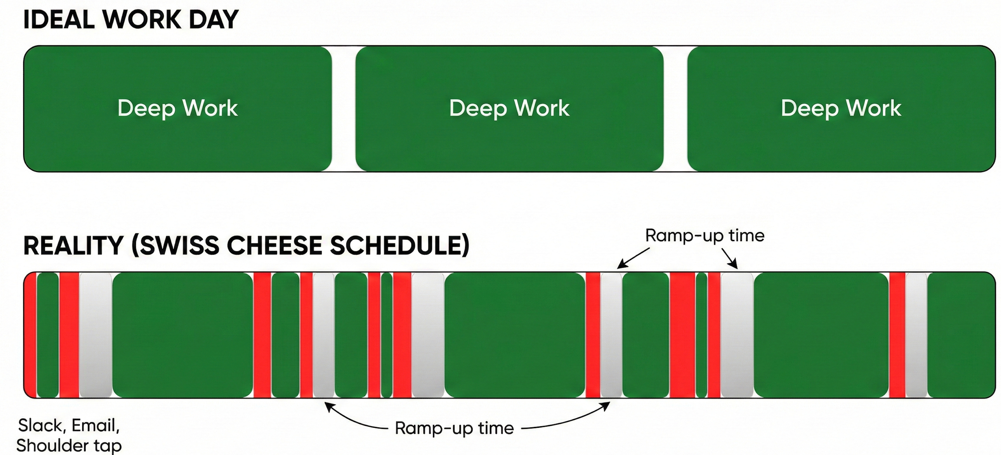 The fix requires a shift in how we view communication. I’d recommend writing a document with context first and sending a link rather than tapping a shoulder. This ensures you do some deeper work preparing the doc, and the other person isn’t interrupted to take a look. I’d also recommend batching your communication. Check messages only at specific slots like 9:00, 10:00... Finally, use visual signals. Wearing noise-canceling headphones is a clearer “Do Not Disturb” sign to the room, even if you are not listening to music. Just make sure you’re not always wearing the headphones.