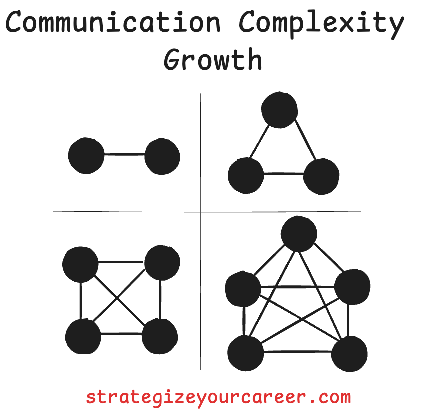 Brooks’s Law states that adding manpower to a late software project makes it later. As the team grows linearly, communication complexity grows exponentially. Two people have one line of communication. Ten people have forty-five lines, which are more than I wanted to draw in the image below.
