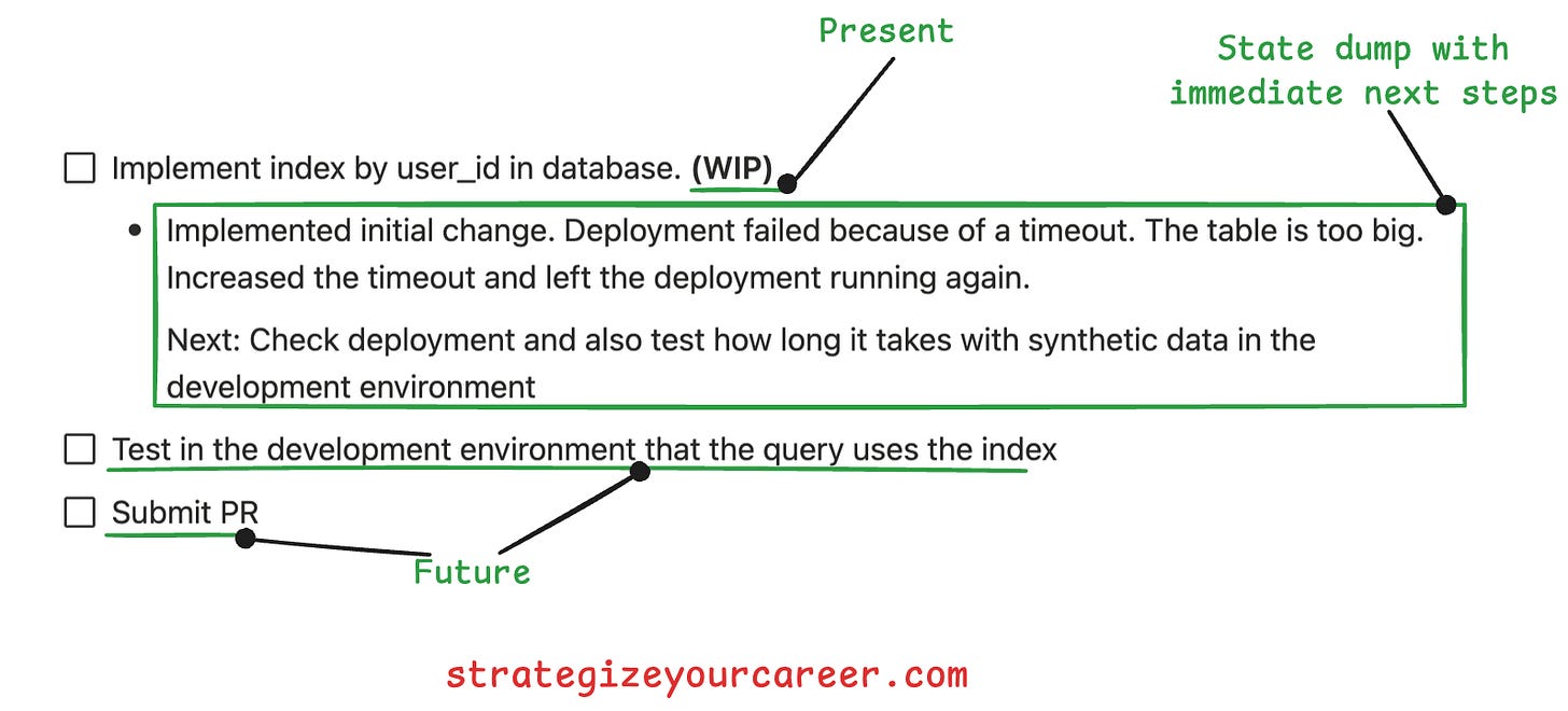 Thanks to stopping only at these logical breaks, you are preventing data loss. I know humans don’t have internal registers or stack frames, but we forget things when we switch tasks, so we need a solution. That’s why we should externalize this. We need to create a small state dump before you yield a task. This records both the last work done, the current work (in case we yield because you’re waiting on something), and our next steps.