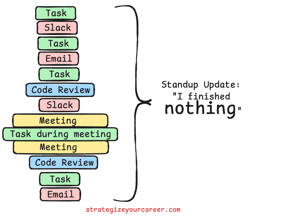 Identify the work that really matters today. I want to be careful, so the message isn’t that you should be selfish and prioritize always making a direct impact through your tasks in a sprint. Some days, the most important work is reviewing a critical pull request from a peer. On other days, you must prioritize your own big impactful work. You must be clear about what the important work is before you start jumping between small tasks.