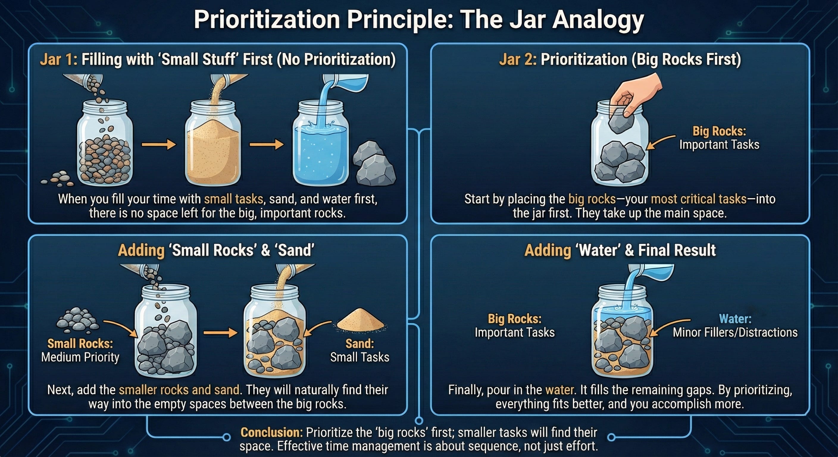 You must distinguish between the big rock and snacking. Small tasks like answering emails or minor code reviews feel productive because you can do a lot of those during the day. They distract you from high-return work. You should focus on one big problem. You cannot juggle four small rocks effectively.