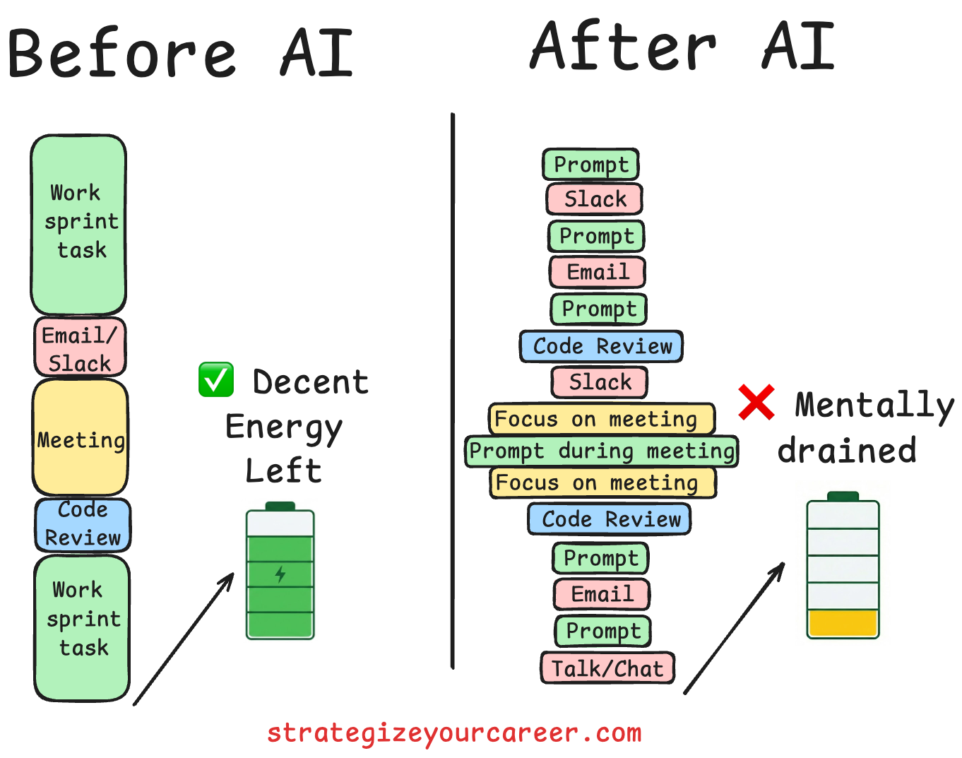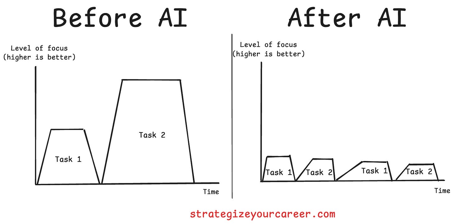 We must distinguish between types of context switching. Multitasking is switching to another context further from the primary one, like checking a Slack message on another project. Updating code in one file and the test in another is not really multitasking because you are still in the code context and the same project/task context. However, switching to Slack or email is a disaster; any context could come from out there. The cumulative effect of hundreds of these micro-switches leads to more decision fatigue. I don’t know about you, but since the use of AI, I’m feeling more mentally drained after work. More things are happening at the same time.