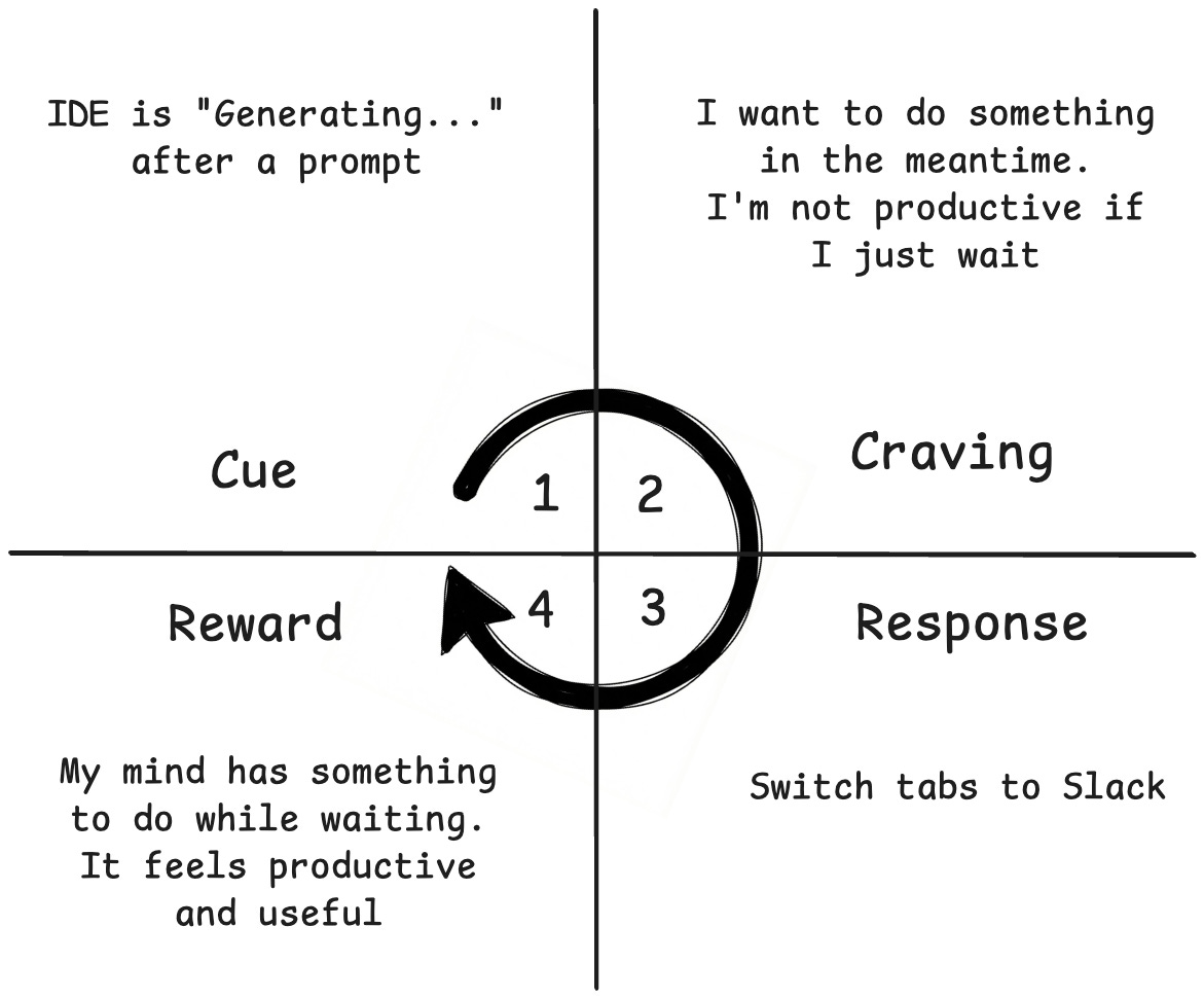 The psychology behind this is the static spinner (or Generating... text) in the IDE. This passive visual cue signals that there is nothing to do here. It gives your brain permission to disconnect. The brain treats this latency as a free pass to check communication channels.