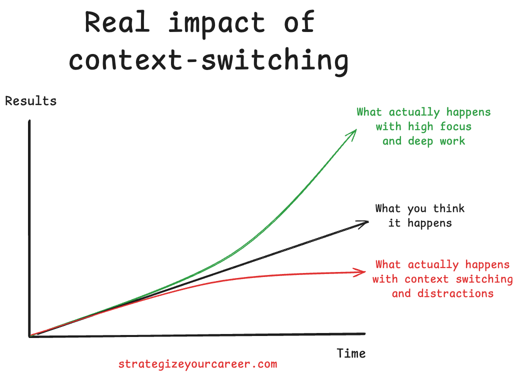 Many engineers fall for the false multitasking myth. They believe they can quickly check a message in 10 seconds. In reality, reading a message loads a completely new context. The return cost is high because switching back requires reloading the code context into working memory. This reloading process often takes longer than the original wait time. It’s like a plane: it takes a lot of energy and time to take off and land, but once it’s “in the zone”, it travels faster. Every time you switch contexts and switch back to the IDE, you have to “take off your task” again.