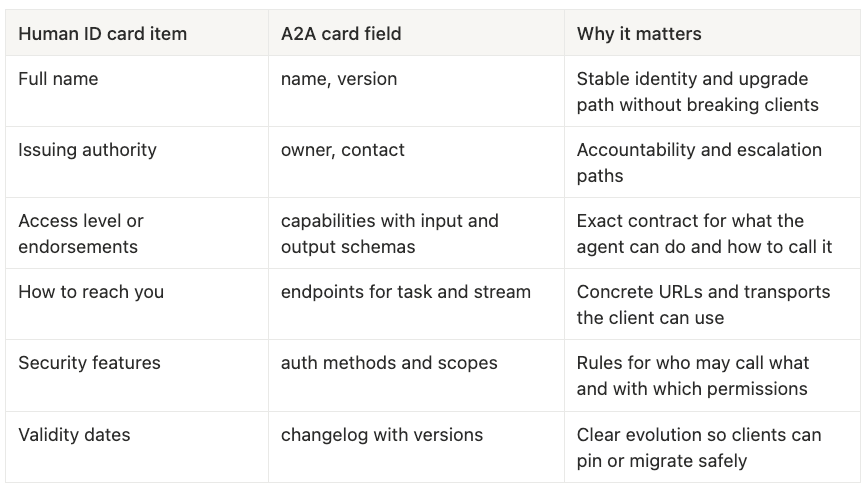 Think of an A2A card as an agent’s ID card. A human ID card tells a guard who you are, who vouches for you, what you are allowed to do, and how to contact your next of kin. An A2A card does the same for software agents. It tells a client agent who owns this agent, what capabilities it exposes, how to talk to it, and what rules apply. The mental model is simple. Clients should never guess. They should read the card, verify it, and then call the capability they need with inputs that match the published schema.
